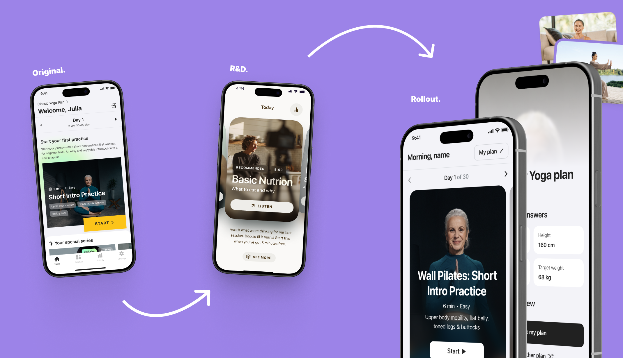 The redesigned activation experience led to a 15% increase in Day 1 retention, with more users completing their first workout and significantly less drop-off between onboarding and activation. By aligning creative, funnel messaging, and in-app experience, we created a consistent narrative that strengthened user commitment from first click to first workout. After validating success in Return, the modular framework was rolled out across Yoga Go and WalkFit, transforming Return into a retention R&D lab and scalable activation system for the portfolio.